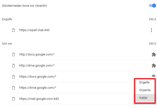 Gittiğiniz sayfada engellediğiniz site bildilerimlerine isterseniz izin, isterseniz de  izin verdiğiniz bildirimlere engel koyabilirsiniz.