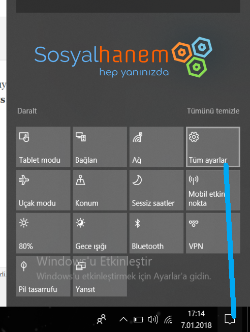 Sağ altta bulunan bildirimler ikonuna tıklayıp Tüm Ayarlar diyoruz.
